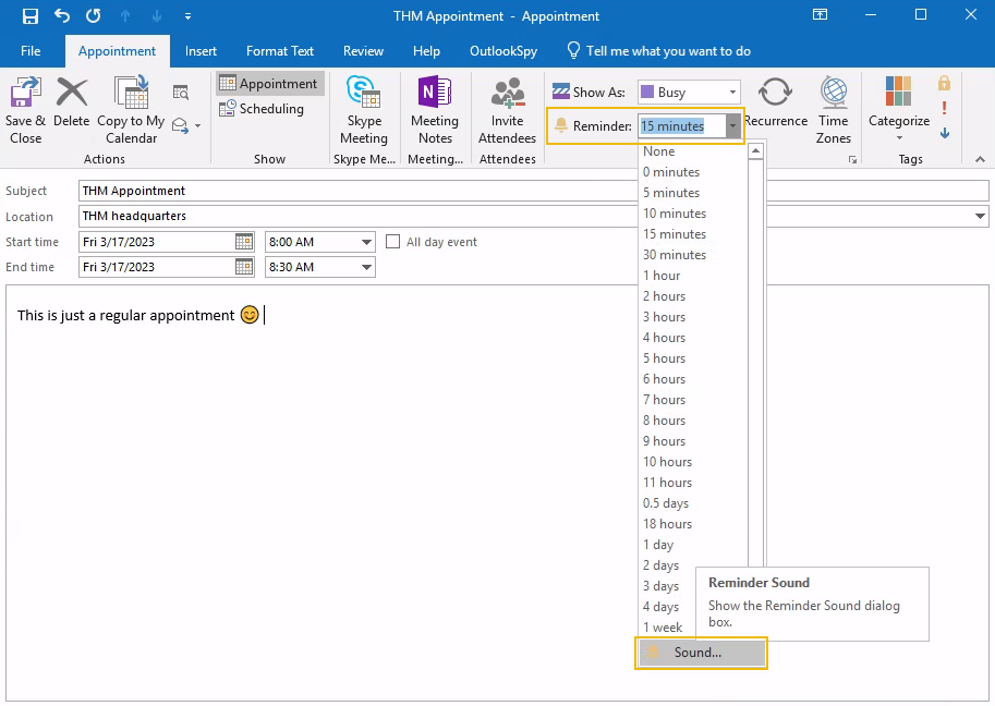 We will create an appointment that includes a reminder set in 0 minutes so that it triggers right after the victim receives it. We will also click on the Sound option to configure the reminder's sound file: