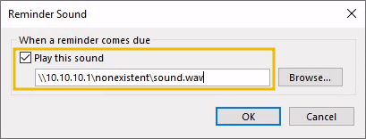 Create a malicious meeting/appointment with a custom reminder sound pointing to a UNC path on the attacker's machine.