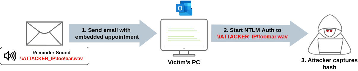 To exploit this vulnerability, an attacker must create a malicious calendar invitation that includes a reference to a sound file pointing to a file in a network share in the attacker's machine. At a low level, an Outlook email stores the reference to the sound file in an internal parameter called PidLidReminderFileParameter. To ensure that the audio we embed in our malicious email will take precedence over the victim's default reminder configurations, we will also need to set another parameter called PidLidReminderOverride to true.