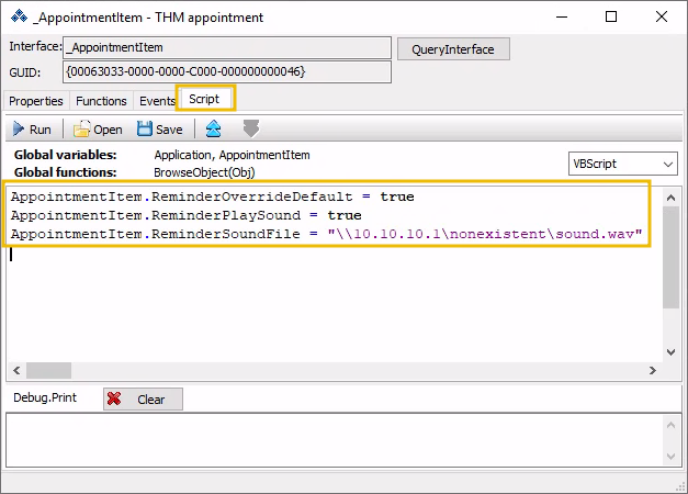 ReminderSoundFile: string with the path to the sound file to be used. For our exploit, this will point to a bogus shared folder in our AttackBox.