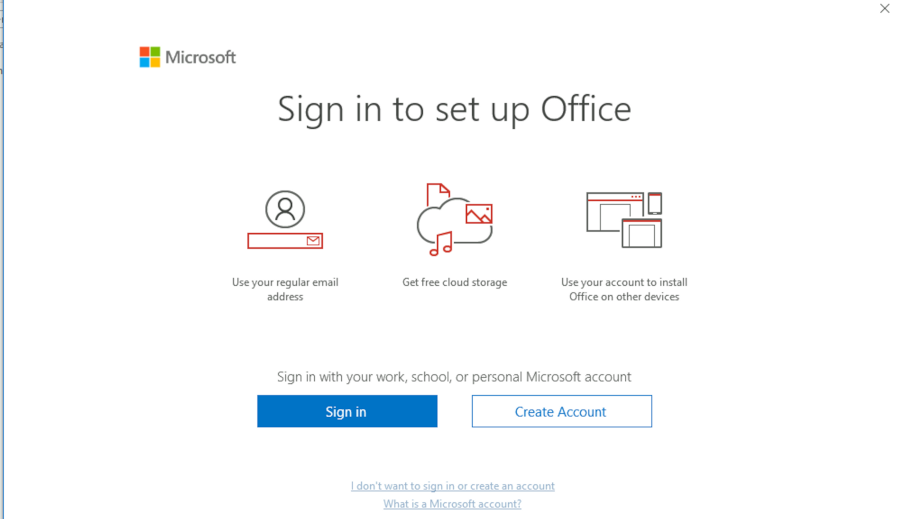 Your VM has a trial version of Outlook installed, so feel free to ignore any activation messages. When opening Outlook, you can also close the "Sign in to set up Office" screen without a problem to continue: