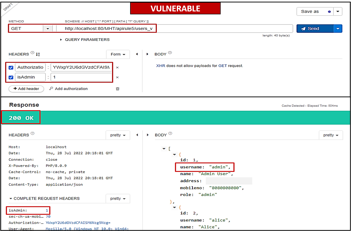 /apirule5/users_vto fetch data of all employees from the database. To add protection, he added another layer to security by adding a special headerisAdminin each request. The API only fetches employee information from the database ifisAdmin=1andAuthorization-Tokenare correct. The authorisation token for HR user Alice isYWxpY2U6dGVzdCFAISM6Nzg5Nzg=.