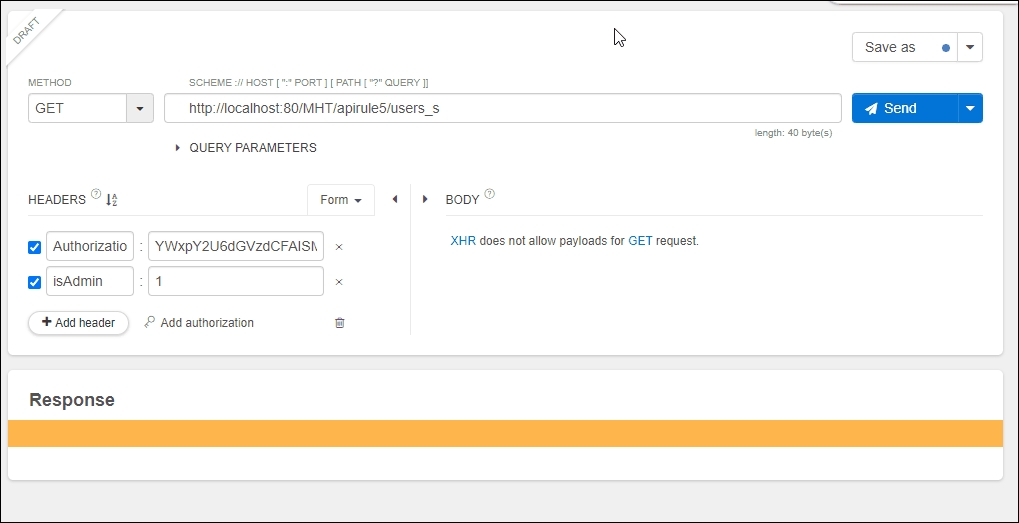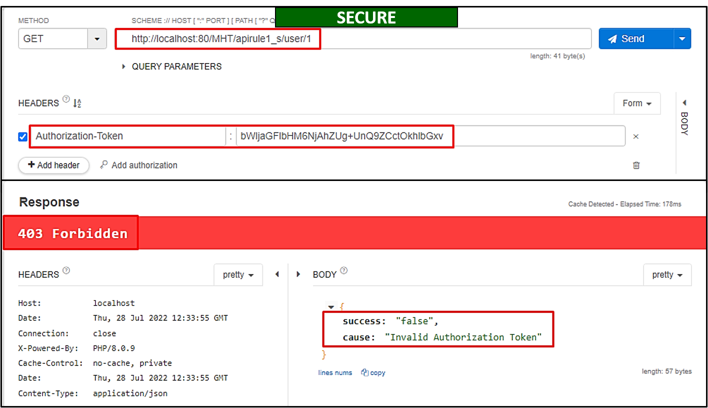 Authorization-Tokenand callhttp://localhost:80/MHT/apirule1_s/user/1, only then will you be able to get the correct results. Moreover, all API calls with an invalid token will show403 Forbiddenan error message (as shown below).