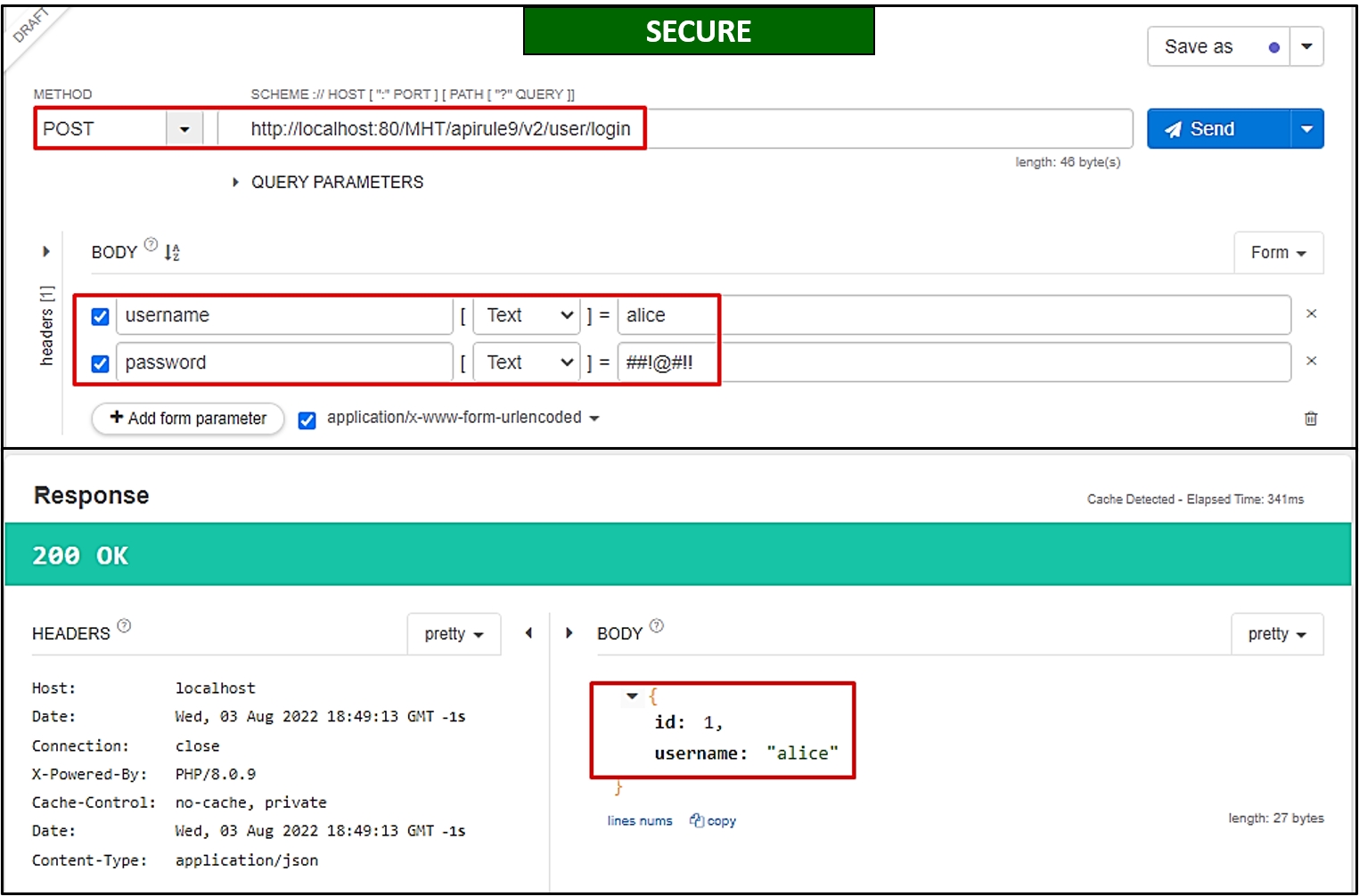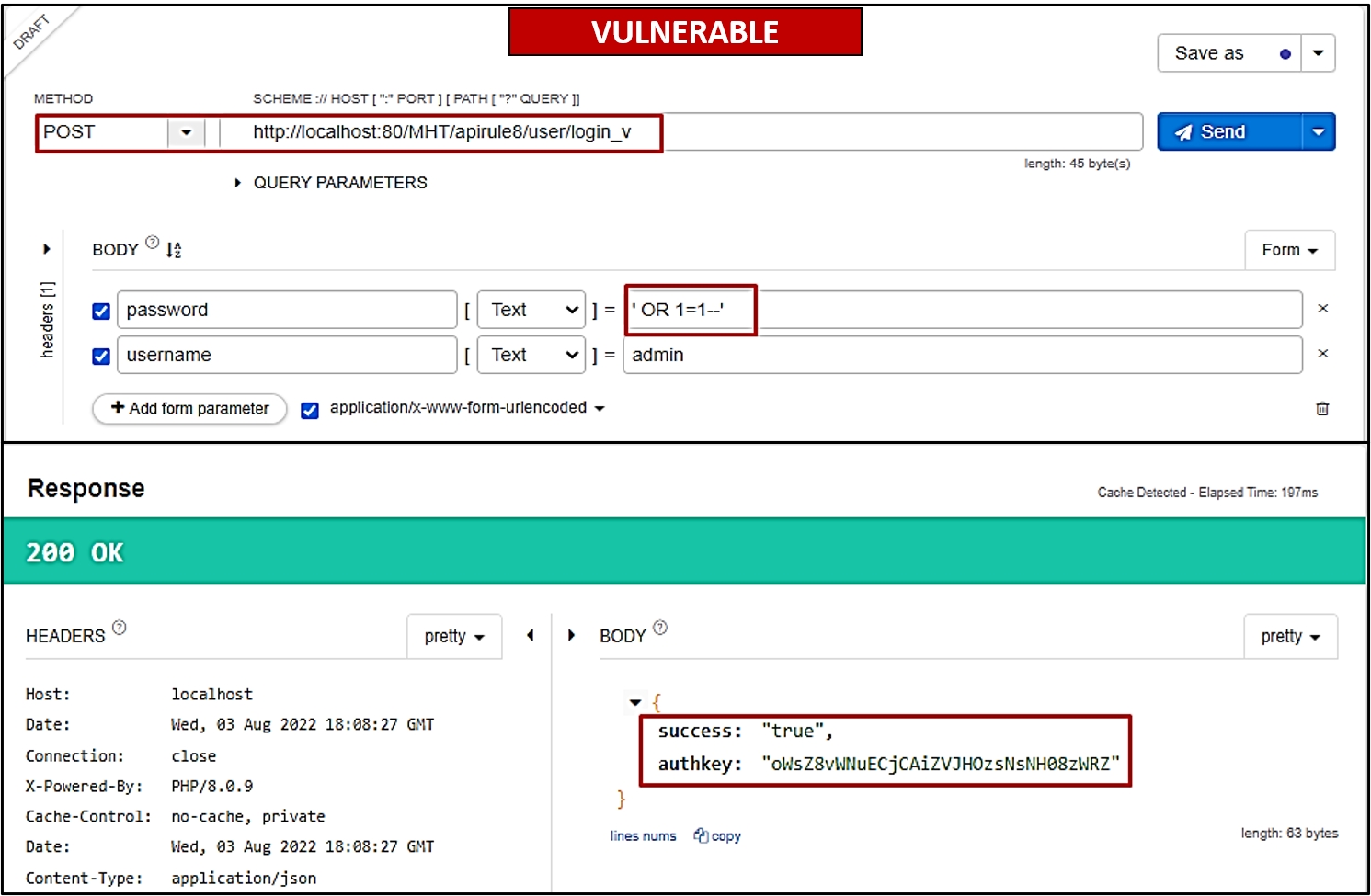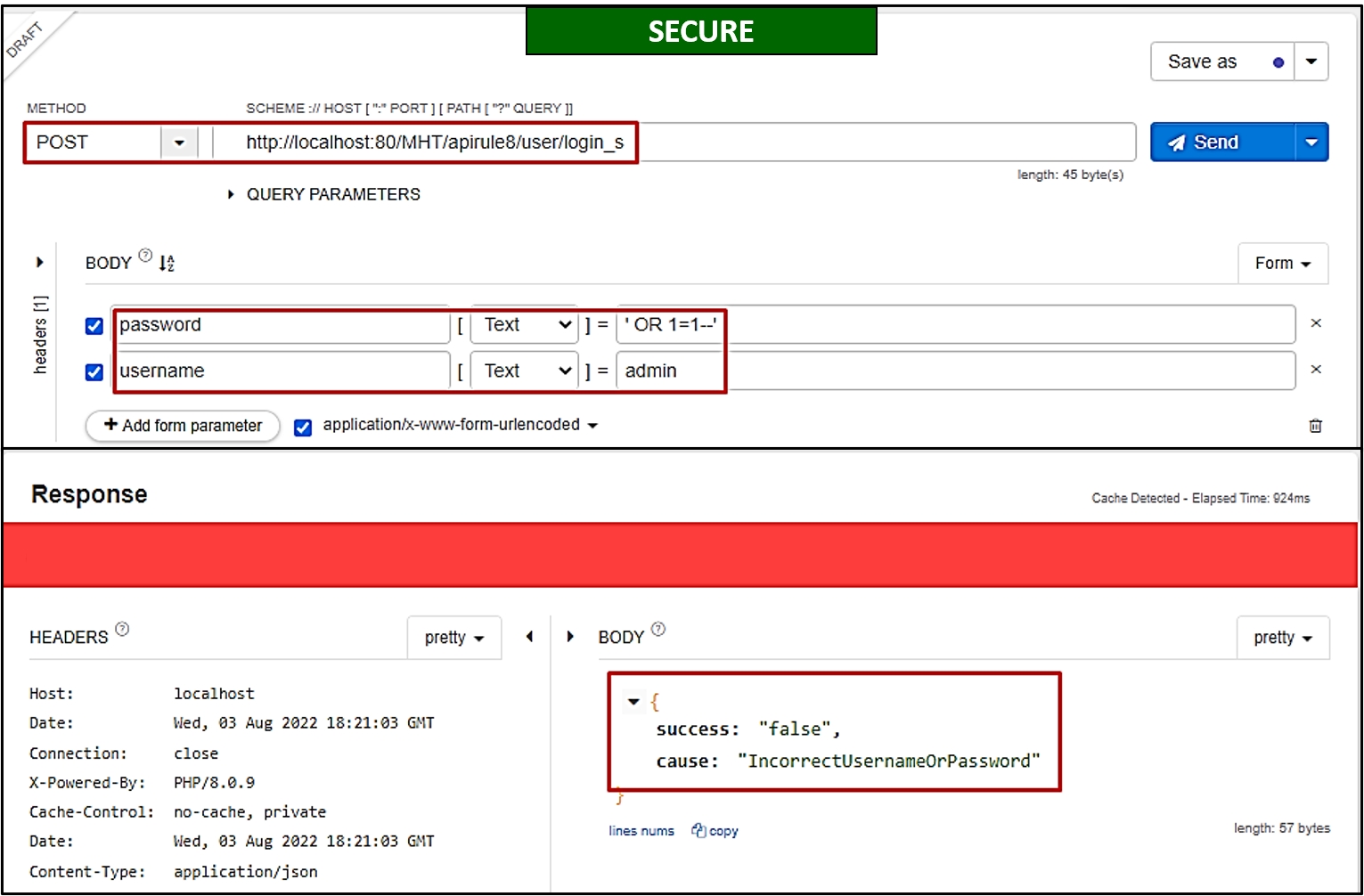 /apirule8/user/login_sand used parameterised queries and built-in filters of Laravel to sanitise user input.As a result, all malicious payloads on username and password parameters were effectively mitigated (as shown below)