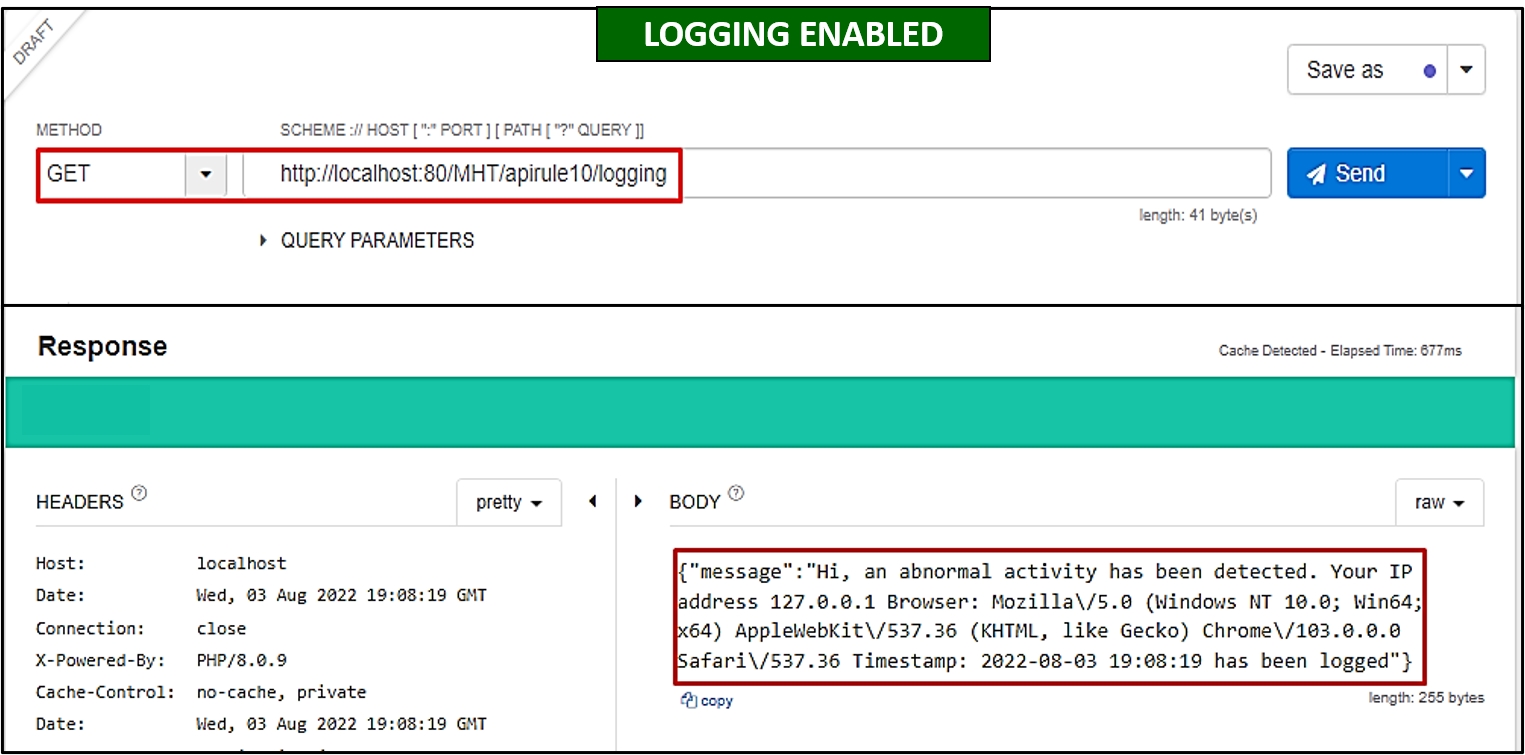 /apirule10/logging(GET) that will log users' metadata (IP address, browser version etc.) and save it in the database as well (as shown below).