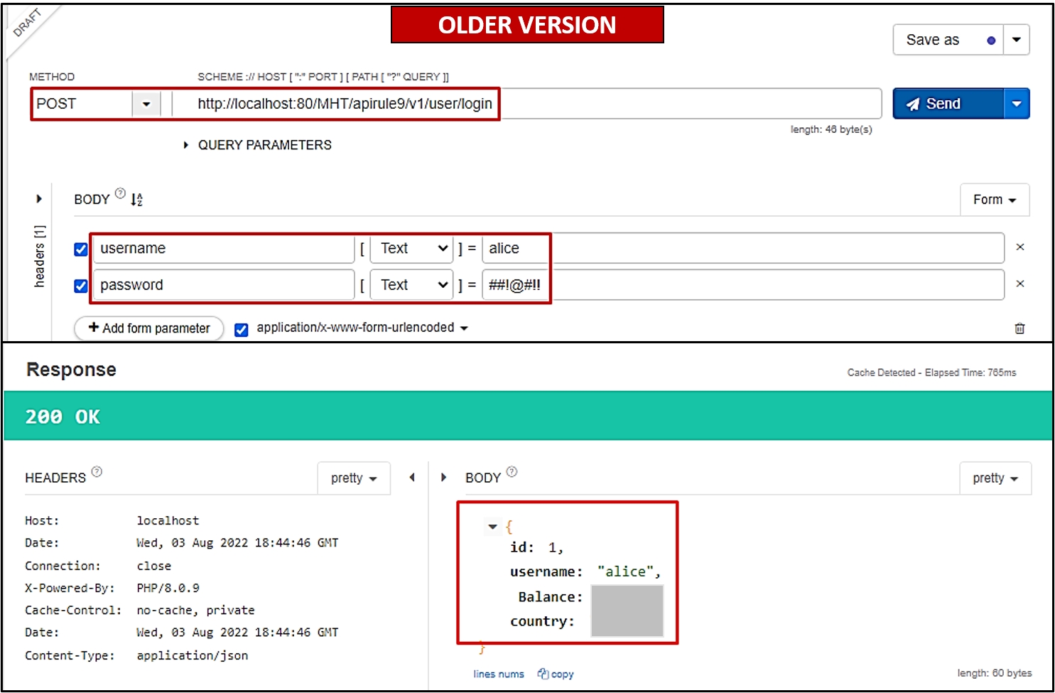 Make an API call to /apirule9/v1/user/login using the username "Alice" and password "##!@#!!".