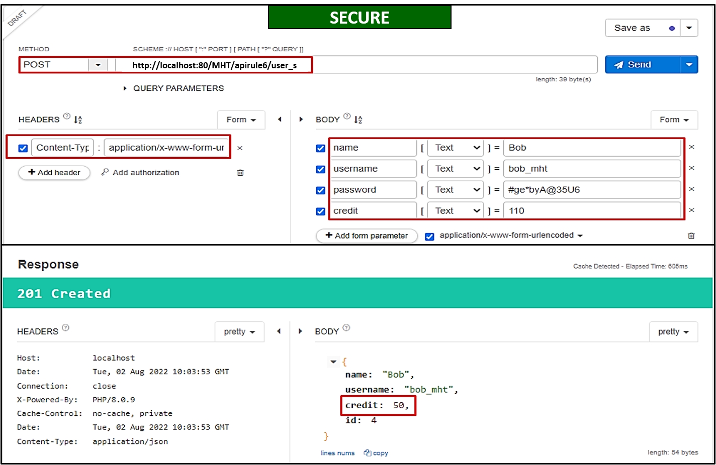 /apirule6/userthat will take a name, username and password as input parameters (POST). The user's table has acredit columnwith a default value of50. Users will upgrade their membership to have a larger credit value.Bob has successfully designed the form and used the mass assignment feature in Laravel to store all the incoming data from the client side to the database (as shown below).