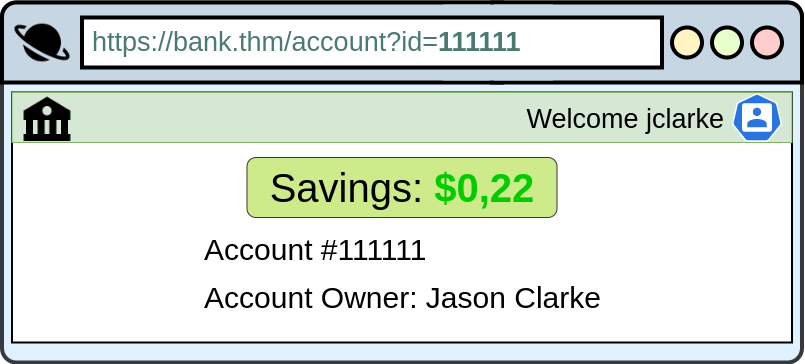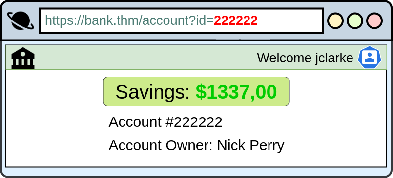 For example, let's say we're logging into our bank account, and after correctly authenticating ourselves, we get taken to a URL like this https://bank.thm/account?id=111111. On that page, we can see all our important bank details, and a user would do whatever they need to do and move along their way, thinking nothing is wrong.