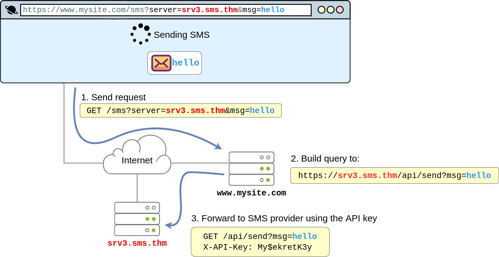 By looking at the diagram above, it is easy to see where the vulnerability lies. The application exposes the server parameter to the users, which defines the server name of the SMS service provider. If the attacker wanted, they could simply change the value of the server to point to a machine they control, and your web application would happily forward the SMS request to the attacker instead of the SMS provider. As part of the forwarded message, the attacker would obtain the API key, allowing them to use the SMS service to send messages at your expense. To achieve this, the attacker would only need to make the following request to your website: