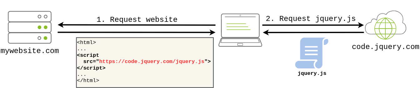 Suppose you have a website that uses third-party libraries that are stored in some external servers that are out of your control. While this may sound a bit strange, this is actually a somewhat common practice. Take as an example jQuery, a commonly used javascript library. If you want, you can include jQuery in your website directly from their servers without actually downloading it by including the following line in the HTML code of your website: