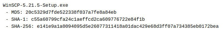 These hashes were precalculated by the creators of WinSCP so that you can check the file's integrity after downloading. If we download the WinSCP-5.21.5-Setup.exe file, we can recalculate the hashes and compare them against the ones published in Sourceforge. To calculate the different hashes in Linux, we can use the following commands: