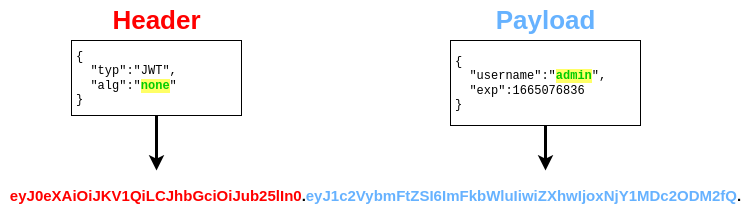 Taking the JWT from before as an example, if we wanted to change the payload so that the username becomes "admin" and no signature check is done, we would have to decode the header and payload, modify them as needed, and encode them back. Notice how we removed the signature part but kept the dot at the end.