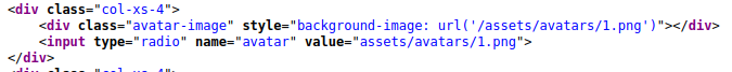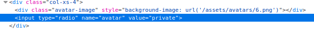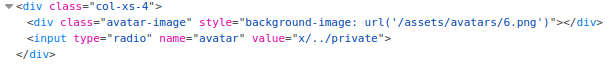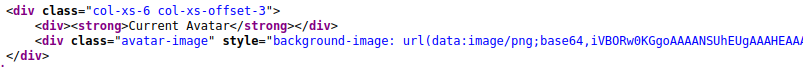 If you choose one of the avatars and then click the Update Avatar button, you'll see the form change and, above it, display your currently selected avatar. Viewing the page source will show your current avatar is displayed using the data URI scheme, and the image content is base64 encoded as per the screenshot below.