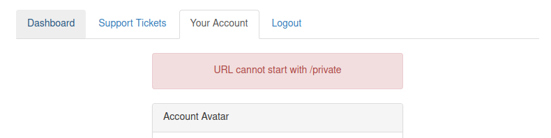As you can see from the error message, the path cannot start with /private but don't worry, we've still got a trick up our sleeve to bypass this rule. We can use a directory traversal trick to reach our desired endpoint. Try setting the avatar value to x/../private