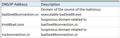 In the spreadsheet excerpt above, based on the description, the direct indicator found by the authors of the documentation is actually just the bad3xe69connection[.]io; however, upon further inspection of the malicious domain, they were able to conclude that two other malicious domains should be recorded as IOCs due to their association with the original malicious domain.