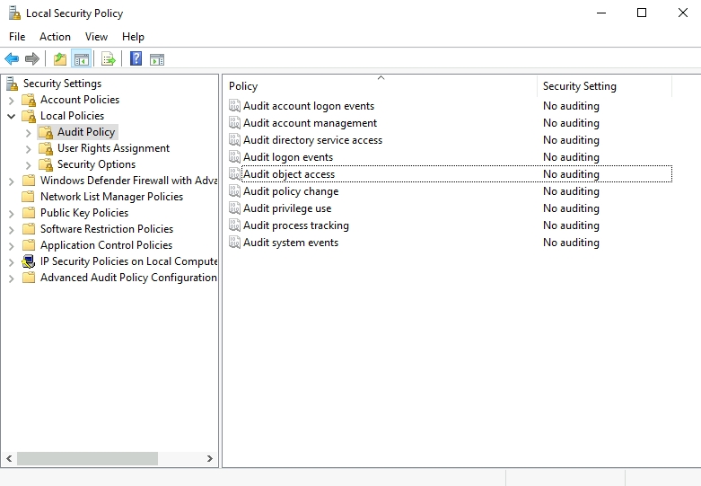 Once the machine has initiated, click on the start icon and type "Local". The Local Security Policy application should appear. Open the application, then navigate to Security Settings → Local Policies → Audit Policy.