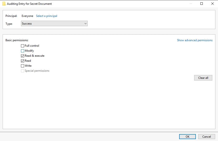 The Principal should now reflect "Everyone" and the permissions should now allow granular selection. Here you can specify all the activities on our Secret Document you want to audit. You can toggle to the advanced permissions via the Show advanced permissions on the upper right-hand corner of the area for an even broader selection of activities. Click OK when you're done exploring, and then click Apply and OK on the Audit entry page. Finally, we click on OK on our Secret Document properties.