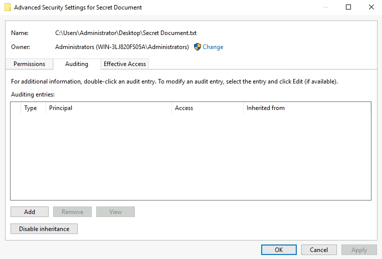 Object Name: C:\Users\Administrator\Desktop\Secret Document.txt