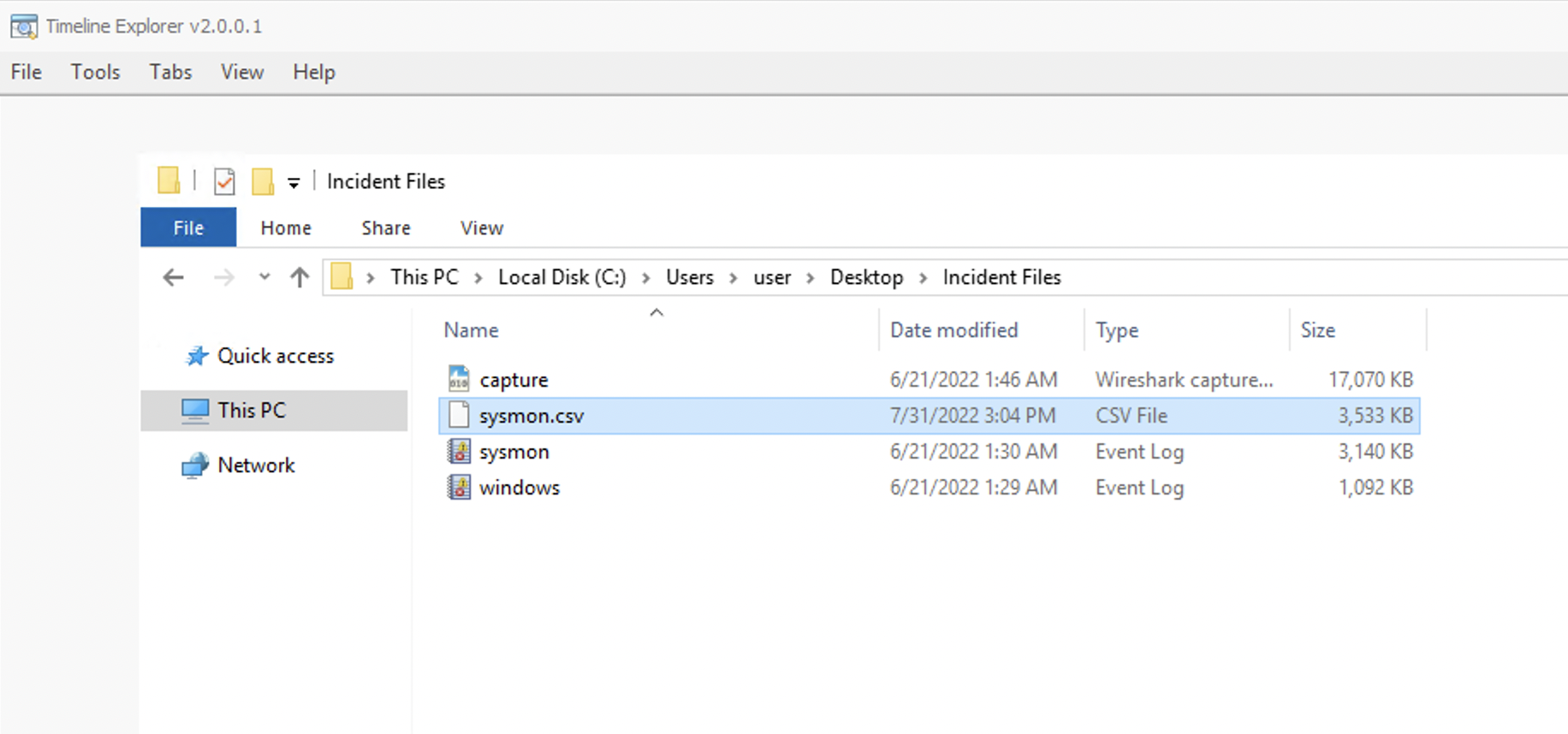 For TimelineExplorer.exe, we can load the exported CSV file by doing the following: File > Open > Choose sysmon.csv from C:\Users\user\Desktop\Incident Files directory