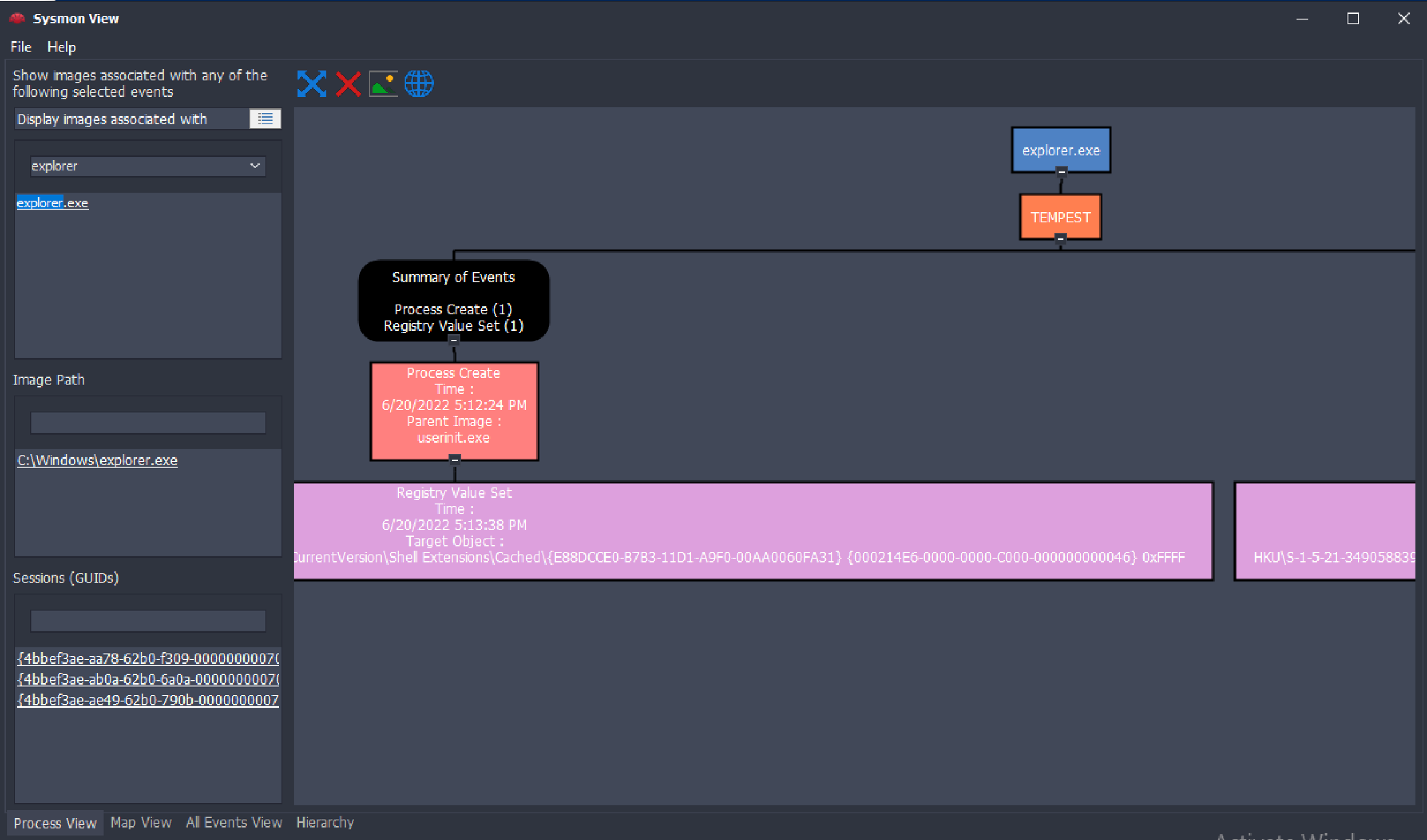 This tool can easily view the correlated events from a specific process. The example above summarises all Sysmon events related to explorer.exe.