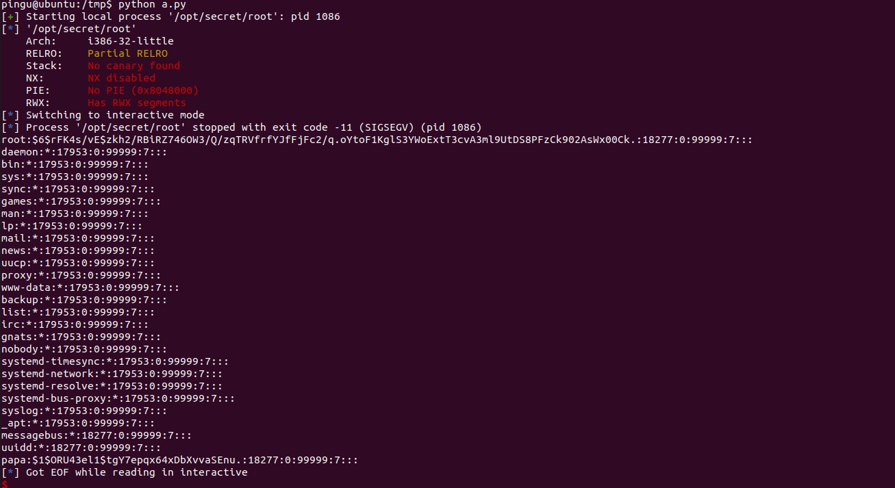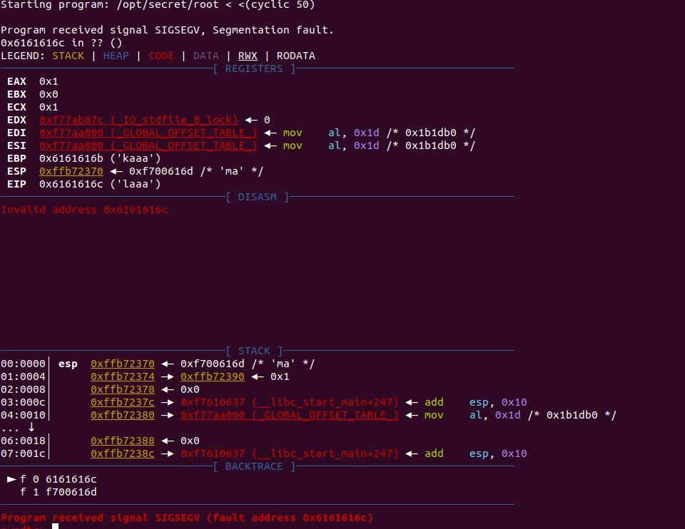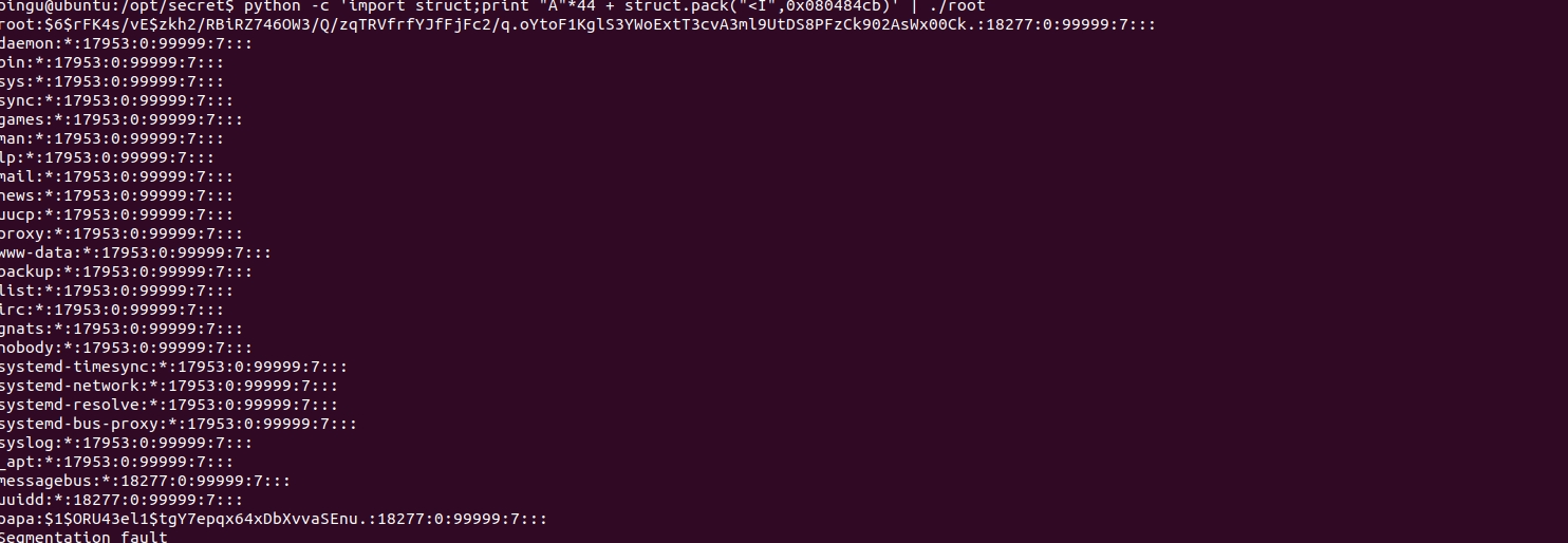 [*] Process '/opt/secret/root' stopped with exit code -11 (SIGSEGV) (pid 1077)