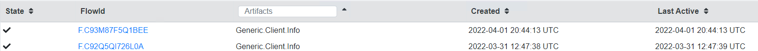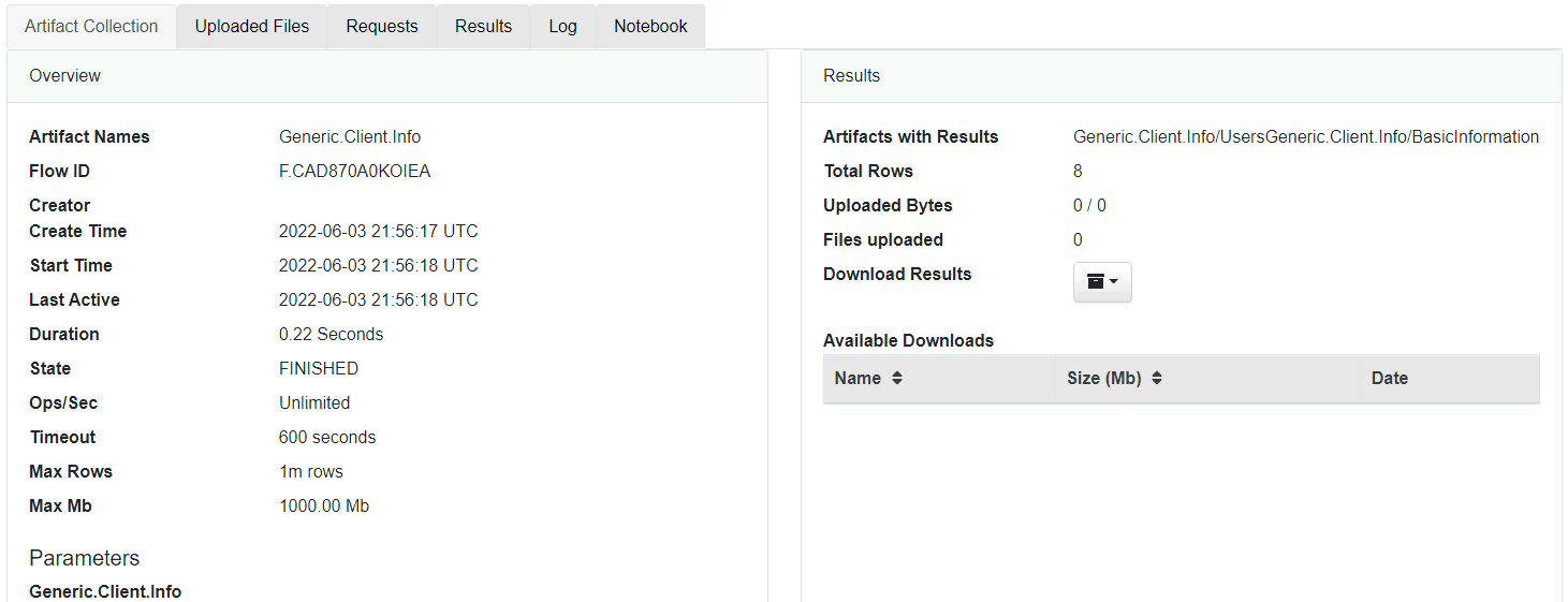 Clicking on any FlowId will populate the bottom pan with additional details regarding the information collected for that artifact or collection.