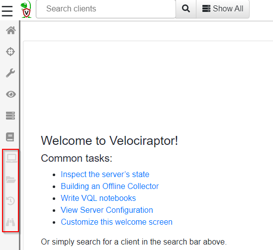 If you didn't notice, some links are grayed out when you first log into Velociraptor. See below.