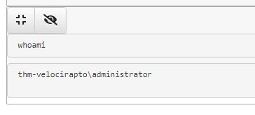 In the example below, the command whoami was executed with PowerShell. The command results are not immediately visible, and the eyeball icon needs to be toggled to see the command results.