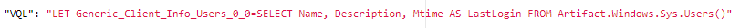 LET Generic_Client_Info_Users_0_0=SELECT Name, Description, Mtime AS LastLogin FROM Artifact.Windows.Sys.Users()