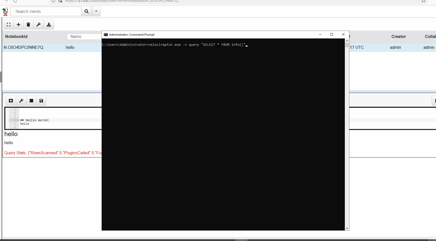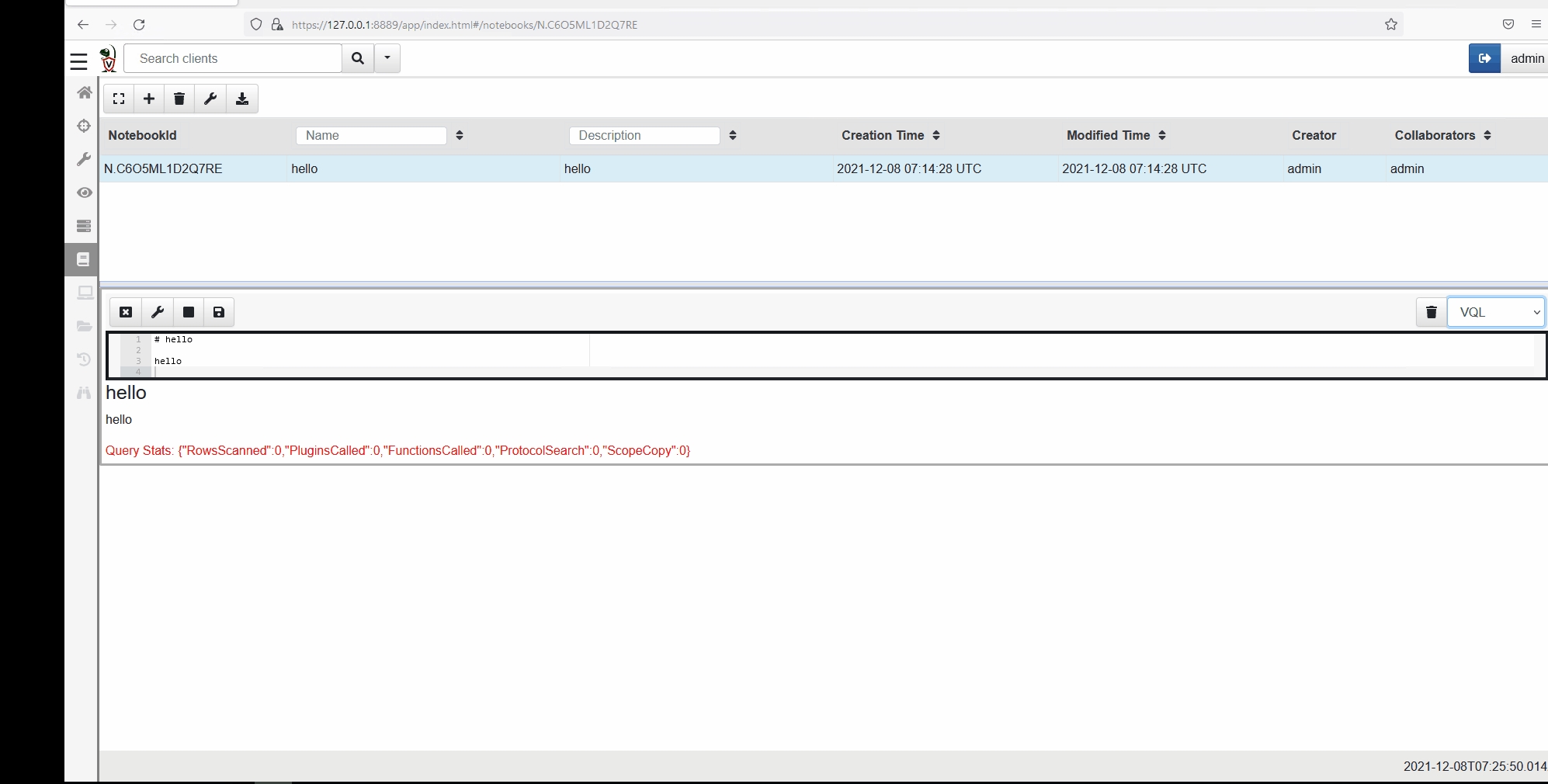 Sweet! Now let's set our notebook to use VQL instead & query basic information from the current agent, we can use SELECT * FROM info()